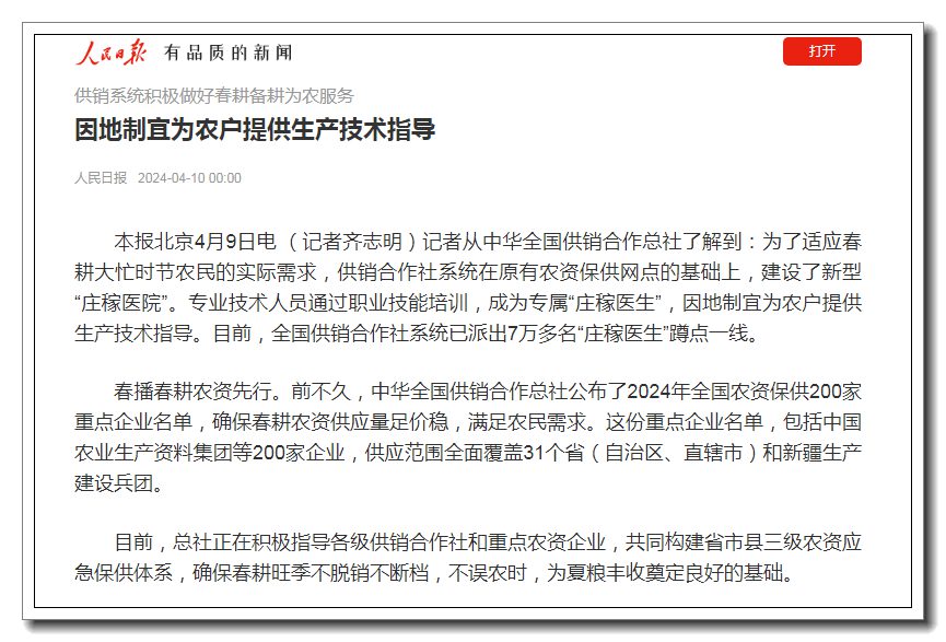 目前,總社正在積極指導各級供銷合作社和重點農(nóng)資企業(yè),共同構建省市縣三級農(nóng)資應急保供體系,確保春耕旺季不脫銷不斷檔,不誤農(nóng)時,為夏糧豐收奠定良好的基礎。