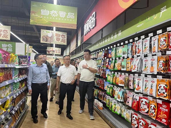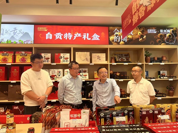 在自然貢品華商旗艦店,劉羽一行重點(diǎn)了解店面經(jīng)營管理模式、商品分區(qū)設(shè)置、產(chǎn)品開發(fā)銷售、供應(yīng)商合作模式、線上商城建設(shè)等方面情況,就推動打造“自然貢品”和“巴食巴適”兩個區(qū)域公用品牌集中展示展銷專區(qū)進(jìn)行了交流探討。
